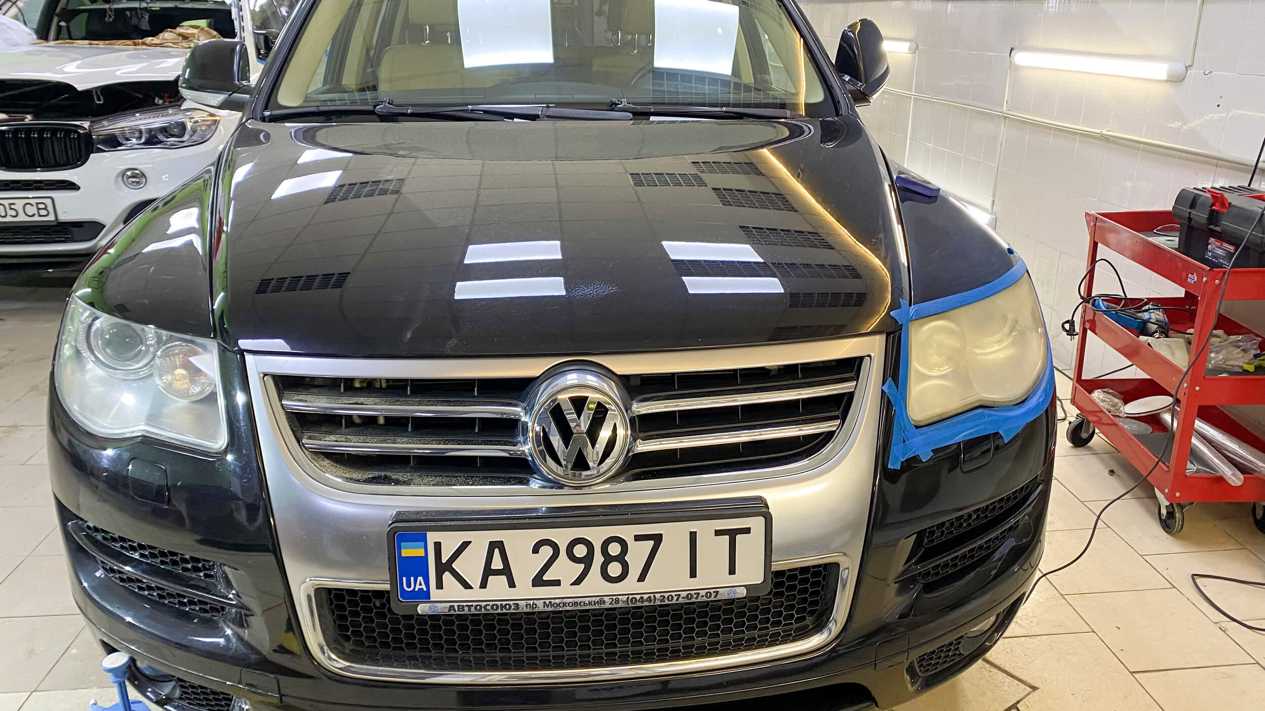 - Оцінка стану та прийняття рішення про необхідність демонтажу фари – при значних пошкодженнях, або простого обклеювання прилеглих поверхонь малярним скотчем для захисту прилеглих поверхонь.